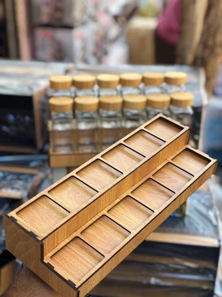 استاند التوابل الخشبي مودرن خانة 12 برطمان مع استيكر قطعة ديكورية في مطبخك و منزلك خامة فاخرة: يتميز رف التوابل بأنه مصنوع من مادة البامبو عالية الجودة، ما يمنحه المتانة وجاذبية جمالية طبيعية. يعد رف البامبو منظمًا مثاليًا، حيث يشتهر البامبو بقوته واستدامته ومقاومته للرطوبة. قابل للتوسيع ومتين: يتميز رف التوابل المكون من 2 طبقات بأنه قابل للتوسيع، ما يسمح لك بضبط عرضه وفقًا لاحتياجاتك. سيضمن هذا الرف الحل المثالي طويل الأمد لتنظيم أساسيات مطبخك حيث يمكنه تحمل وزن زجاجات التوابل والبرطمانات. موفر للمساحة: بفضل تصميمه الصغير، لن يشغل رف تنظيم المطبخ هذا الكثير من المساحة الرأسية في مطبخك. سيقوم الرف بتنظيم مجموعة التوابل الخاصة بك بكفاءة، مع توفير مساحة جيدة على الطاولة أو دولاب المطبخ. سهل الاستخدام: يتميز رف التوابل بتصميم متدرج، ما يسمح لك بتحديد التوابل التي تريدها