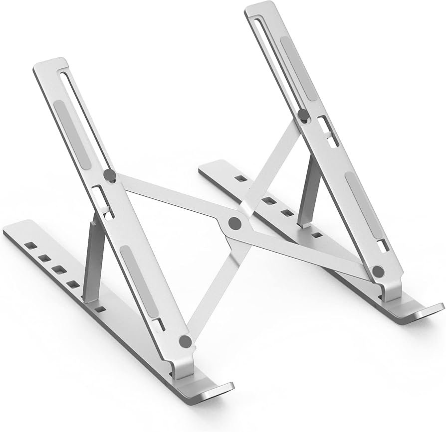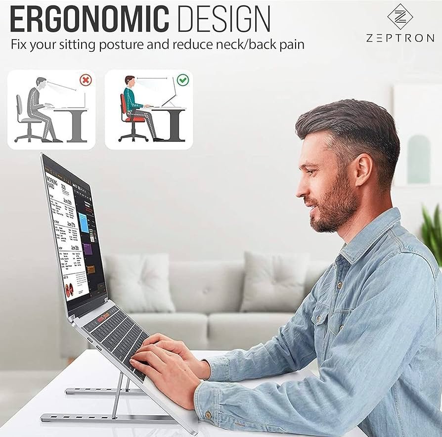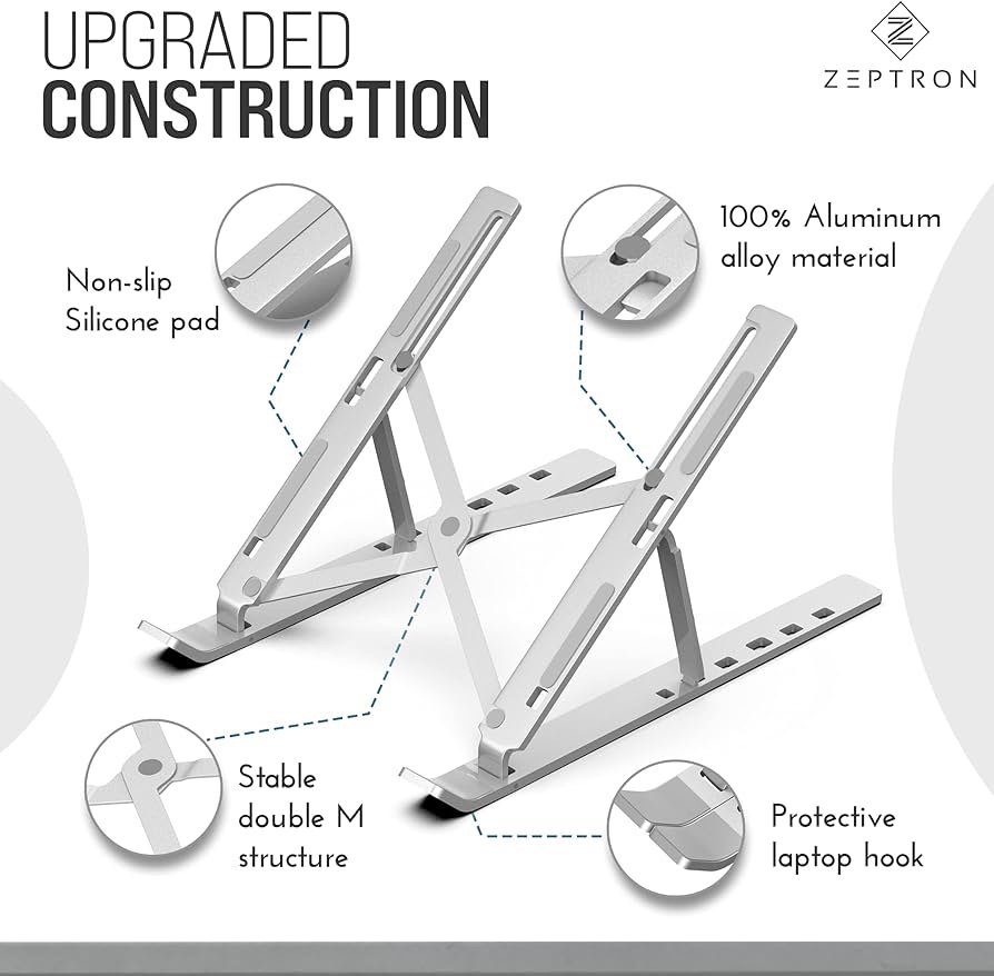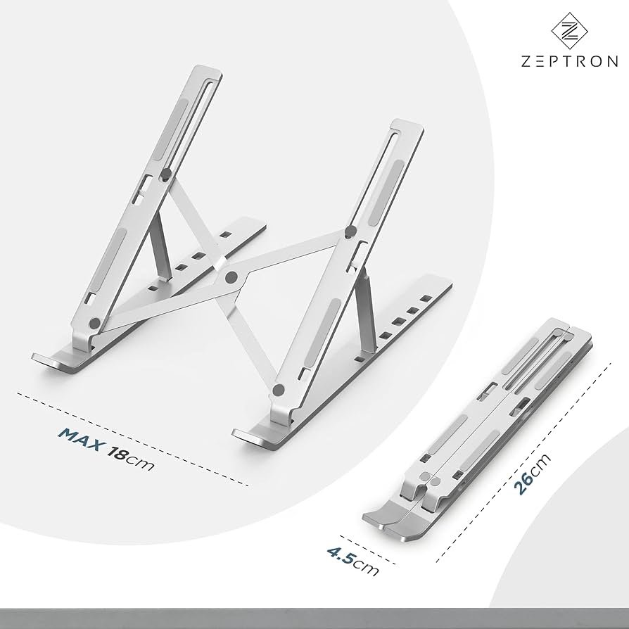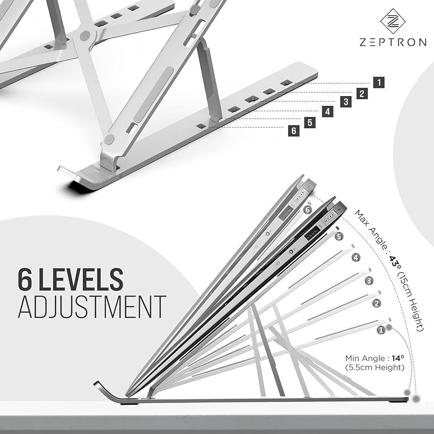 حامل لاب توب ونوت بوك 15.6 بوصة والموبايل والتابلت والكتب من زيبترون قابل للطي ومحمول مصنوع من خليط الالومنيوم، حامل مطاطي مضاد للانزلاق وقابل لتعديل الزاوية والارتفاع حتى 6 مستويات (فضي)