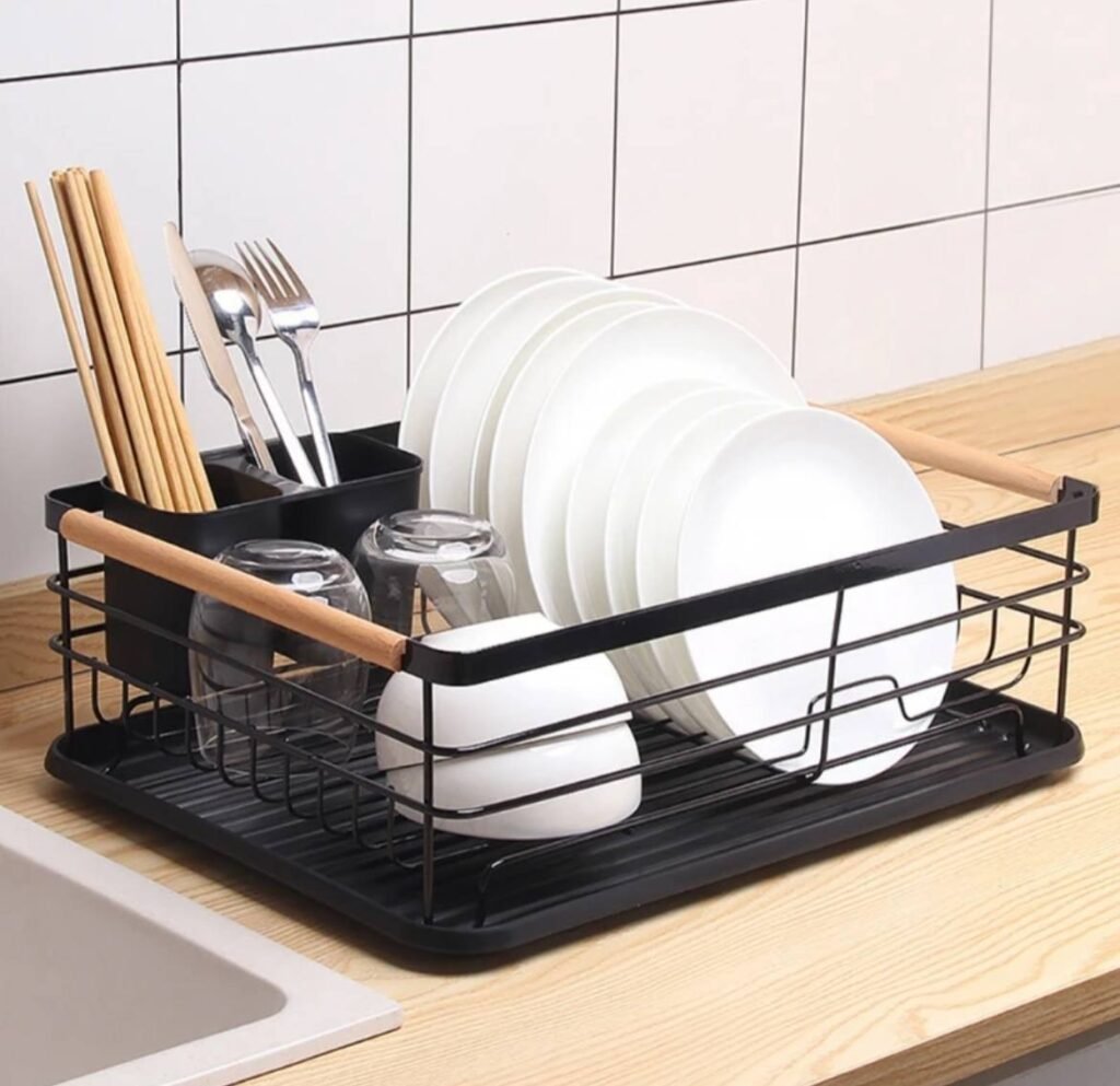 رف تجفيف عملي وأنيق مصنوع من المعدن المتين مع مقبض خشبي يمنح لمسة عصرية لمطبخك. يتميز بتصميم واسع يسمح بترتيب الأطباق، الأكواب، وأدوات المائدة بشكل منظم. مزود بعلبة جانبية لحفظ المعالق والشوك والعيدان، وقاعدة بلاستيكية تمنع تسرب الماء وتحافظ على نظافة سطح المطبخ.