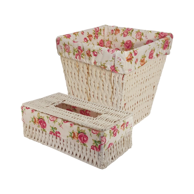 صُممت هذه السلة الأنيقة من مواد منسوجة بلون أبيض نقي، وتتميز ببطانة داخلية من قماش ناعم مزين بنقوش ورود وردية رقيقة تضفي عليها طابعاً ريفياً ساحراً.