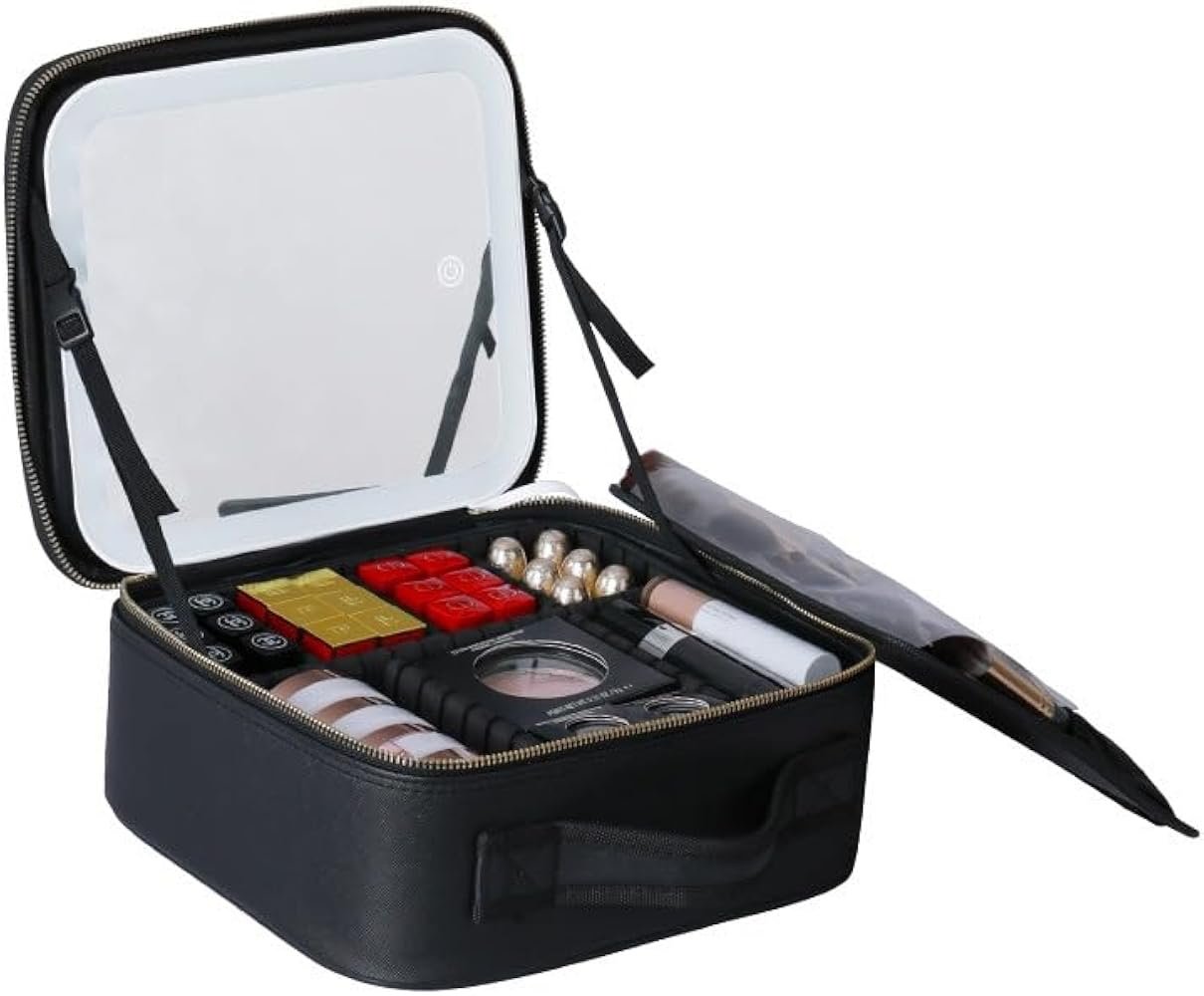 شنطة مكياج للسفر، شنطة منظمة للمكياج مع مراة مضيئة كبيرة و3 اوضاع الوان وسطوع قابل للتعديل، شنطة مكياج من جلد البولي يوريثين المقاوم للماء، شنطة سفر لمستحضرات التجميل، اكسسوارات هدايا ادوات الزينة