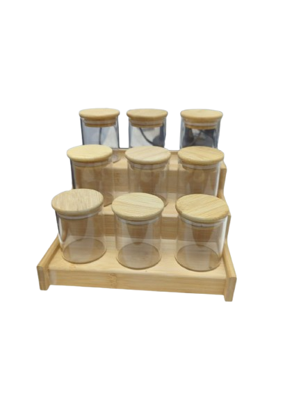 طقم برطمانات توابل زجاج 100مل بغطاء خشب طبيعي مع ستاند أنيق من البامبو