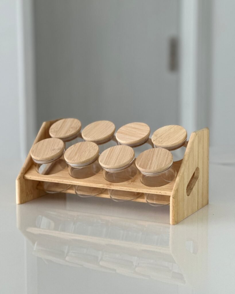 مع الحامل الخشبي المصمم بعناية، ستبقى جميع بهاراتك منظمة وفي متناول يدك على سطح المطبخ. وداعًا للفوضى وصعوبة البحث عن التوابل؛ فكل شيء سيكون منظمًا ومرتبًا أمام عينيك.