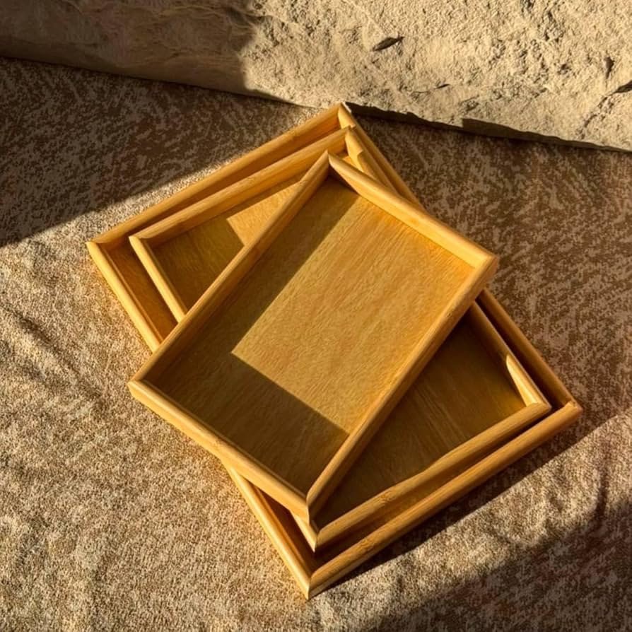 طقم صواني تقديم ٣ قطع خشب مقاوم للماء بني فاتح