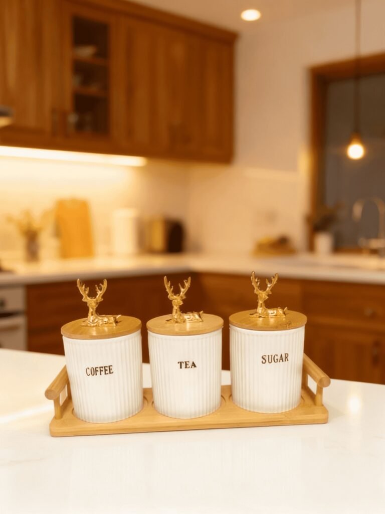 - علب من السيراميك الأبيض: ذات نقوش طولية (مُضلعة) مميزة، ومكتوب عليها أسماء المحتويات بوضوح (COFFEE, TEA, SUGAR).