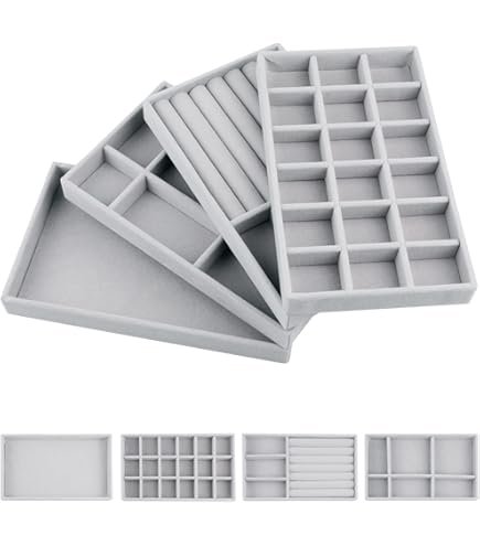 نقدم لكِ الحل الأمثل لتنظيم مجوهراتك الثمينة! هذا الطقم المكون من أربع صواني تنظيم مستقلة يتيح لكِ تخصيص المساحة لتناسب كل أنواع مجوهراتك.