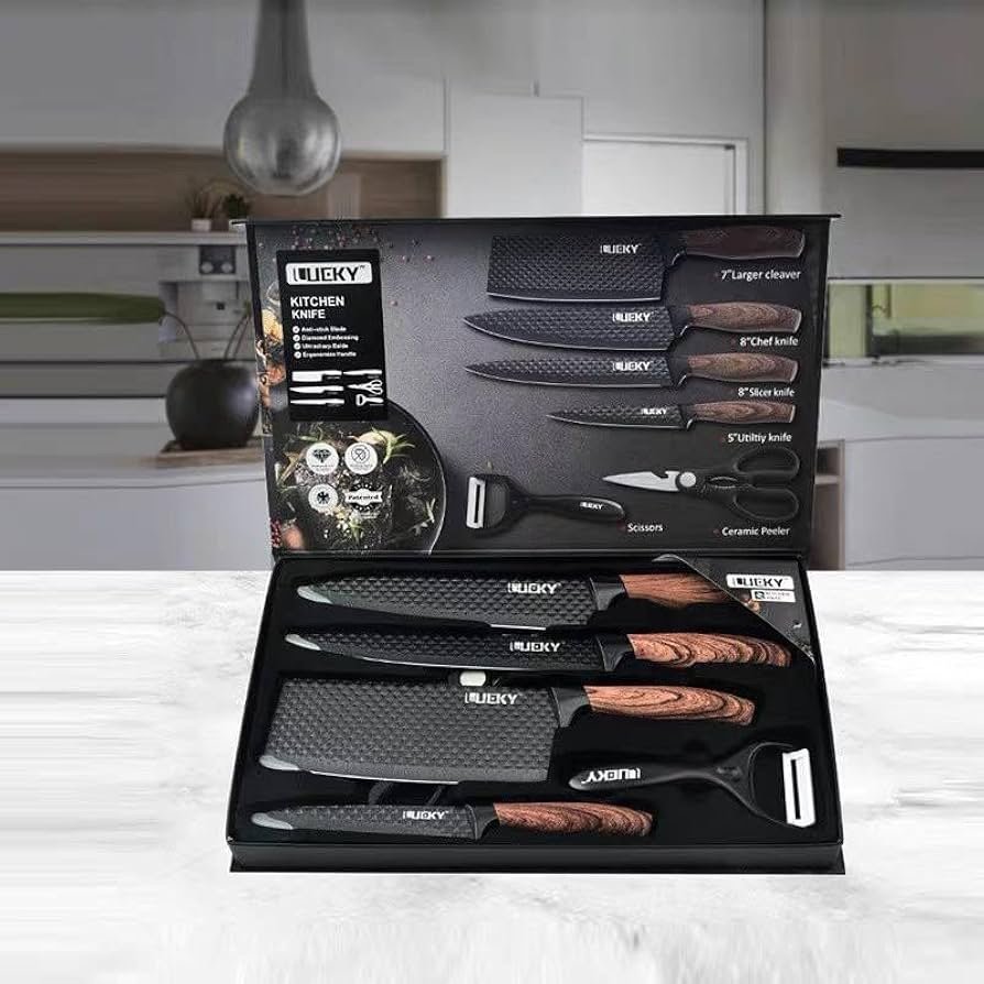 - 🔪 طقم متكامل 6 في 1: يشمل سكينة شيف 8 بوصة، سكينة تقشير 3 بوصة، سكينة تقطيع 8 بوصة، سكينة متعددة الاستخدام 5 بوصة، ساطور 7 بوصة، ومقص مطبخ 8 بوصة، بالإضافة إلى مقشرة وسن سكاكين.